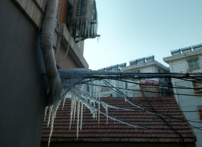 2月4日下午,淮海農場城南15號樓樓頂出現自來水泄漏現象,泄漏下來的水流不僅把二樓墻壁上的空調凍成了冰凌團子,漏下來的水沿著水管四濺,造成二樓的主樓梯口成了水簾洞,臺階也成了易滑跟頭的冰臺階。無論是空調還是冰臺階甚至高懸在頭頂的冰凌,都存有極大的安全隱患。