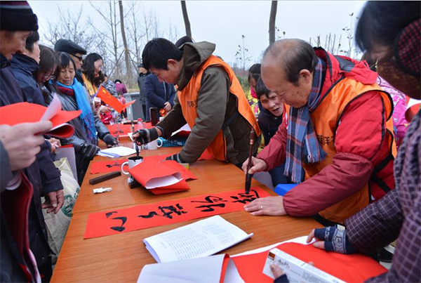 下午3時,場子一鋪開,書法愛好者們揮毫潑墨、筆走龍蛇,不一會兒,一幅幅珍貴的墨寶便誕生在紅彤彤的正丹紙上,一句句祝福的話語,寄托著職工居民對農(nóng)歷新年的憧憬和向往。活動現(xiàn)場,前來領(lǐng)取春聯(lián)的職工居民三五成群,熱鬧非凡,其中,“春回大地,福滿人間”等大紅喜聯(lián)最受歡迎,不一會兒便被搶選一空。