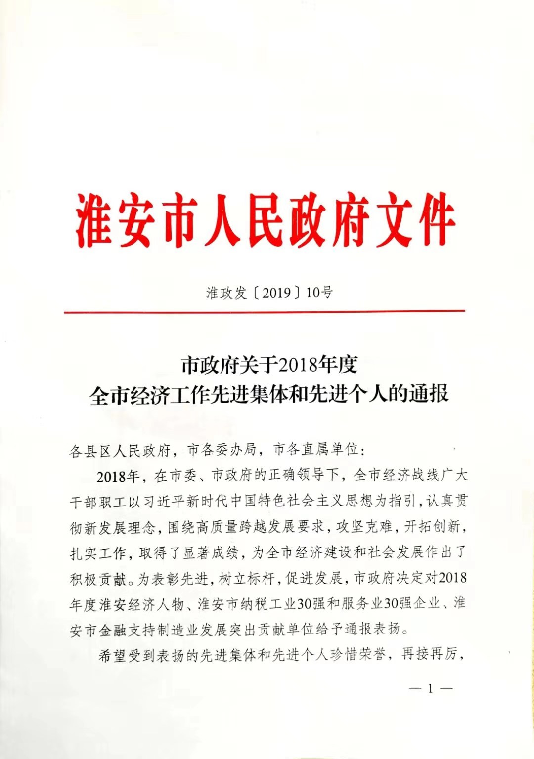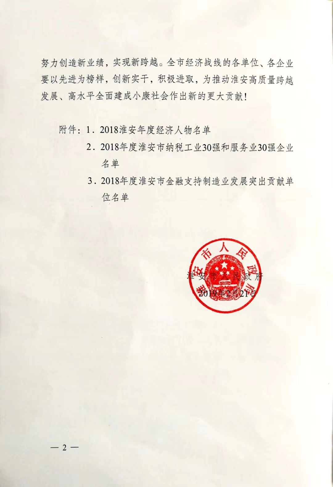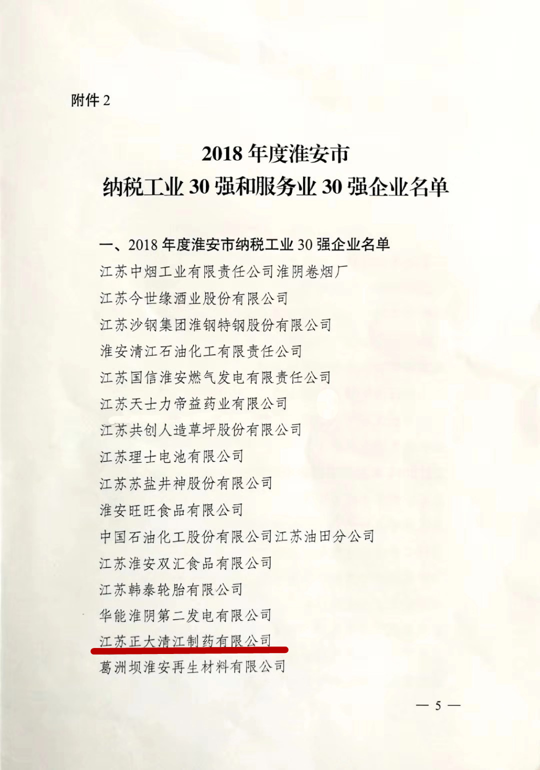 為表彰先進、樹立標桿、促進淮安地方經濟邁向高質量發展行列,近日,淮安市人民政府發起和組織開展的“淮安經濟人物、淮安市納稅工業30強和服務業30強企業、淮安市金融支持制造業發展突出貢獻單位“評選活動在揭曉并正式向社會發布,正大清江制藥以年納稅額超億元榮登2018年淮安市納稅工業30強企業”15位至此正大清江制藥已連續年躋身“市納稅工業三十強企業”行列。