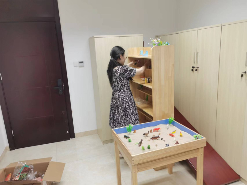 目前,淮海農(nóng)場(chǎng)社區(qū)民政辦正緊鑼密鼓的建立服務(wù)流程和日常管理需要的各類(lèi)制度,建立健全困境兒童臺(tái)賬和活動(dòng)臺(tái)賬,預(yù)估10月底前,“淮海農(nóng)場(chǎng)未成年人保護(hù)站”的各項(xiàng)設(shè)施完善配置,并正式開(kāi)放。圖為社區(qū)民政辦工作人員正布置心理咨詢(xún)室設(shè)施。