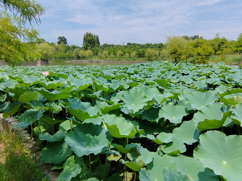 隨著氣溫持續升高,公園內的荷花競相開放,荷葉碧翠欲滴,展一副接天蓮葉無窮碧,映日荷花別樣紅的魅力畫卷,讓人感受到一絲絲涼意。周邊居民陳先生“有了荷花,這里的夏天更加漂亮了”。湖邊是垂柳依依,隨風浮動。荷葉一個接著一個鋪了滿塘,有的盛著晶瑩剔透的水珠,不禁想起小時候不懂事,會把荷葉折下來,拿在手中轉圈圈。