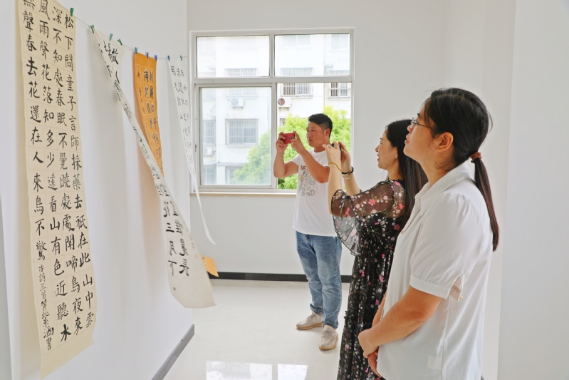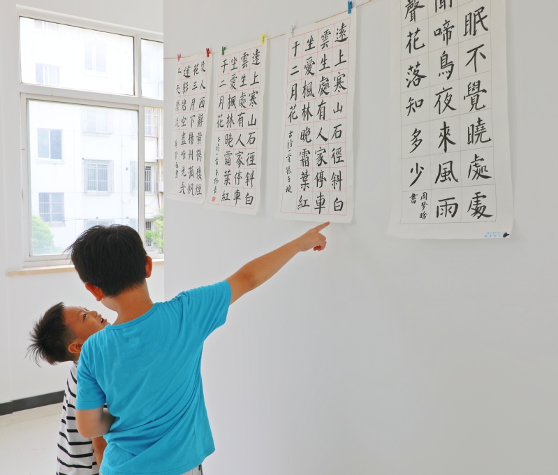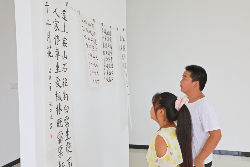 8月28日,在江心沙職工書屋二樓,一場為期一周,象征著收獲的青少年書法展,吸引了不少職工居民和學(xué)生前來觀覽。圖為“書迷”們觀摩“暑期公益課堂·書法班”“結(jié)業(yè)”作品的溫馨場景。