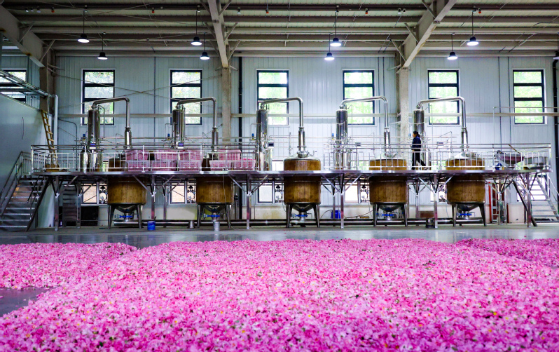 2017年,公司轉型升級,依托當?shù)鬲毺貧夂颍ǔ?00畝大馬士革玫瑰標準化示范基地,鮮花畝產量穩(wěn)定在550公斤以上,種植水平行業(yè)領先。2020年4月,品牌在原有基礎上新增芳香油、化妝品等品類注冊,聯(lián)合上海愛迦儷日用化妝品廠,以自產玫瑰精油、純露為原料,推出純露、復方精油、保濕精華水、修護面膜、香薰等天然護膚品,迅速贏得市場青睞。品牌聚焦技術創(chuàng)新,自主研發(fā)的循環(huán)式多功能香料提取設備等成果,斬獲五項國家專利。