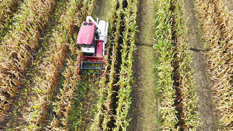 今年江蘇農墾大豆玉米帶狀復合種植面積達12萬畝,目前大豆玉米已經陸續成熟。圖為蘇墾農發東辛分公司農機在田間收割大豆。