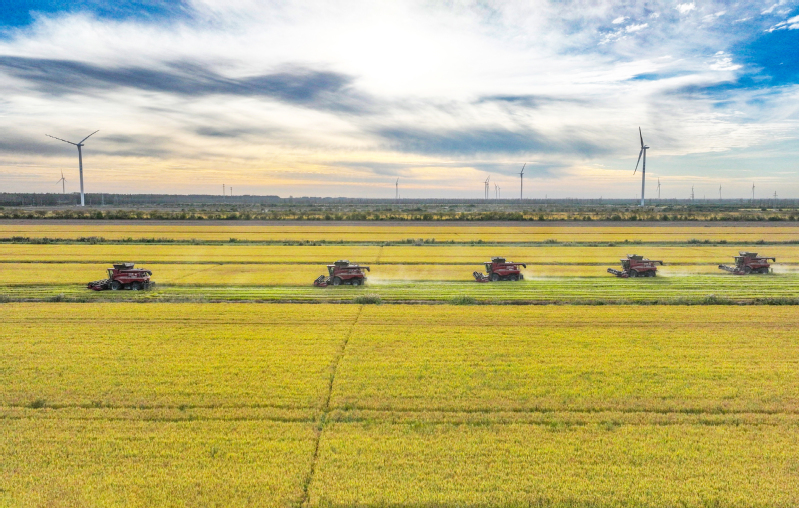 2023年10月28日,在蘇墾農發(fā)新洋分公司新南生產區(qū)19大隊的高標準農田上,五臺凱斯7088大型聯(lián)合收割機穿梭在稻田中搶收水稻。蘇墾農發(fā)新洋分公司搶抓晴好天氣,發(fā)揮農墾企業(yè)機械化優(yōu)勢,確保秋糧顆粒歸倉。