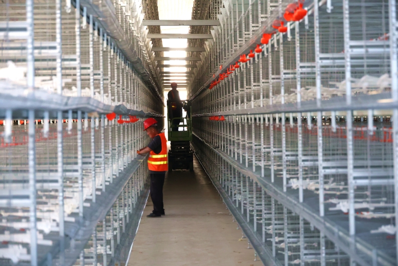 近日,新曹農場抓好抓實百萬羽蛋雞產業項目工程建設,全力以赴加快工程進度,確保年底一期工程完工,沖刺四季度。圖為現代化雞舍內部,工人緊鑼密鼓安裝、調試雞籠設施。