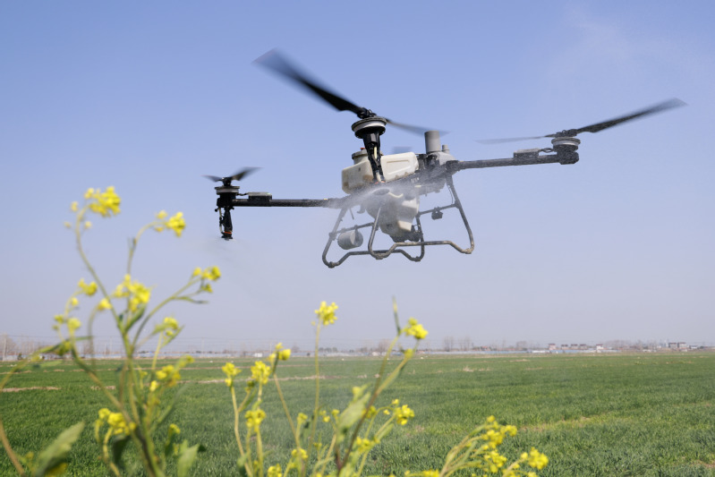 在三河農場邱上營分場的麥田里,植保無人機進行飛防作業。  顏懷峰 錢厚紅 攝