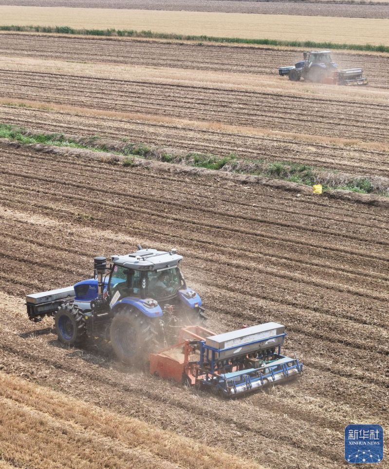 5月28日,揚州大學(xué)研制的“九合一”稻麥耕播機在三河農(nóng)場播稻種(無人機照片)。新華社記者 季春鵬 攝