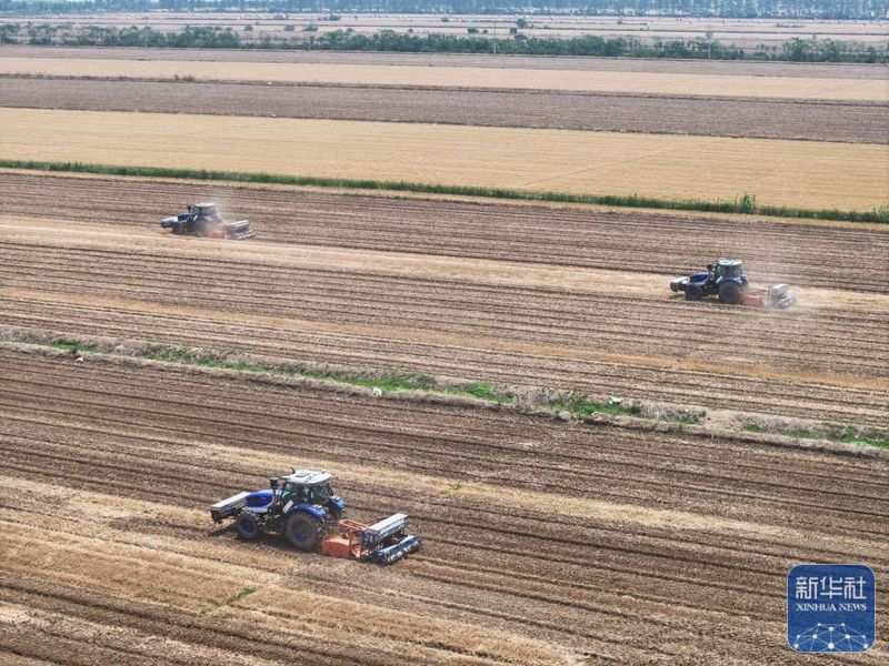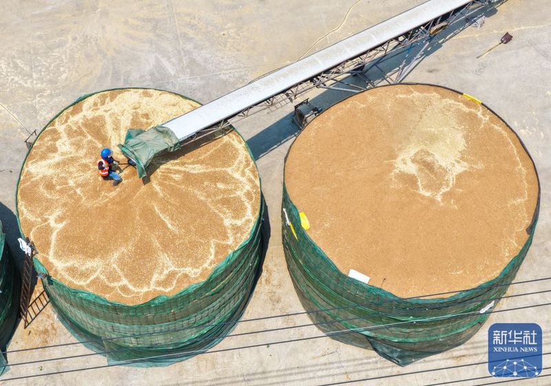 三河農(nóng)場收獲的小麥進入大華種業(yè)三河分公司存儲(5月28日攝,無人機照片)。新華社發(fā)(許昌銀攝)