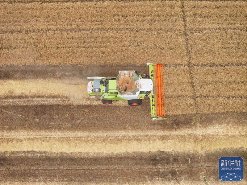 5月28日,收割機在三河農(nóng)場收割小麥(無人機照片)。新華社記者 季春鵬 攝