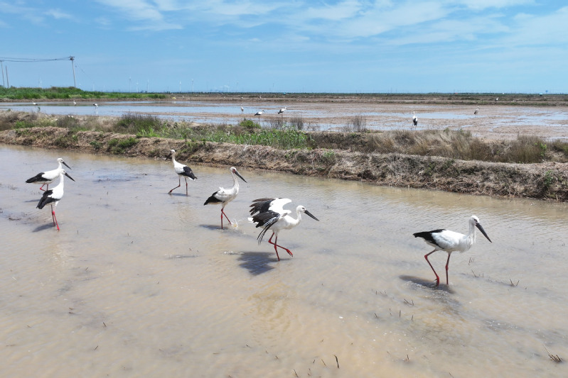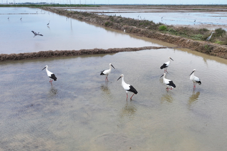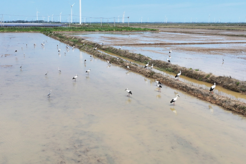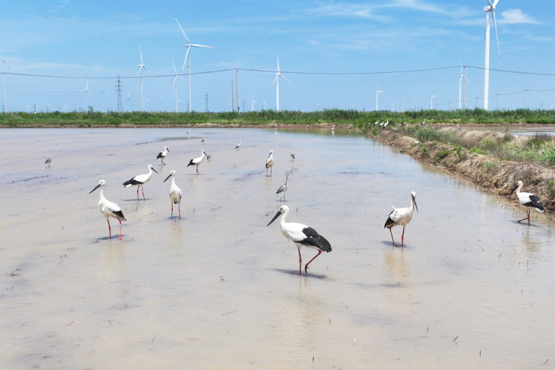 6月23日,江蘇省鹽城市射陽(yáng)縣臨海農(nóng)場(chǎng)順泰生產(chǎn)區(qū)的水田里,50余只國(guó)家一級(jí)保護(hù)動(dòng)物東方白鸛姿態(tài)優(yōu)雅,正悠然漫步、覓食,與水田的碧波相互映襯,構(gòu)成一幅靈動(dòng)的生態(tài)畫(huà)卷。