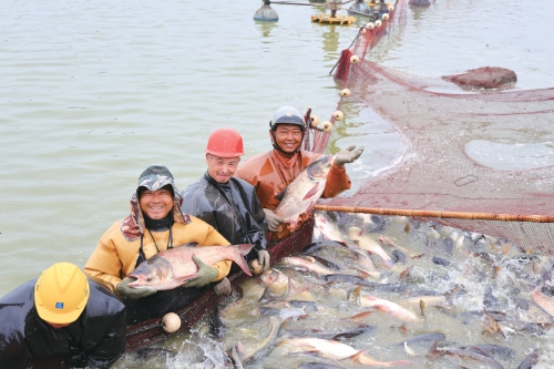 近日,江蘇省連云港市海州區(qū)的江蘇農墾崗埠農場,工人們在魚塘里拉網捕撈分揀花鰱、白鰱等水產品,準備發(fā)往周邊市場銷售。