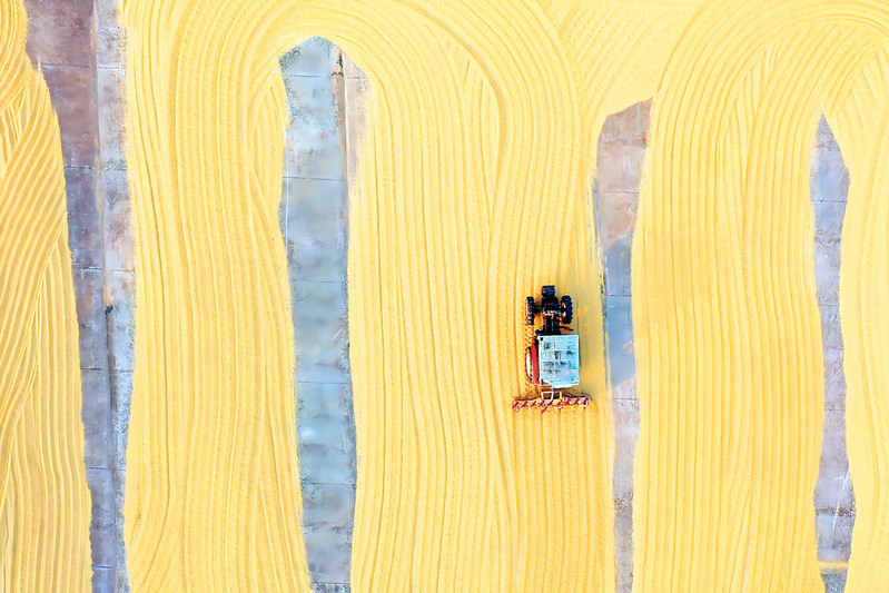 10月27日,連云港市海州區(qū)的江蘇農(nóng)墾崗埠農(nóng)場,職工駕駛糧食翻曬機(jī)械在場上來回穿梭,翻曬剛剛收獲的水稻。 陶桂軍 嚴(yán)連鳳 攝(視覺江蘇網(wǎng)供圖)