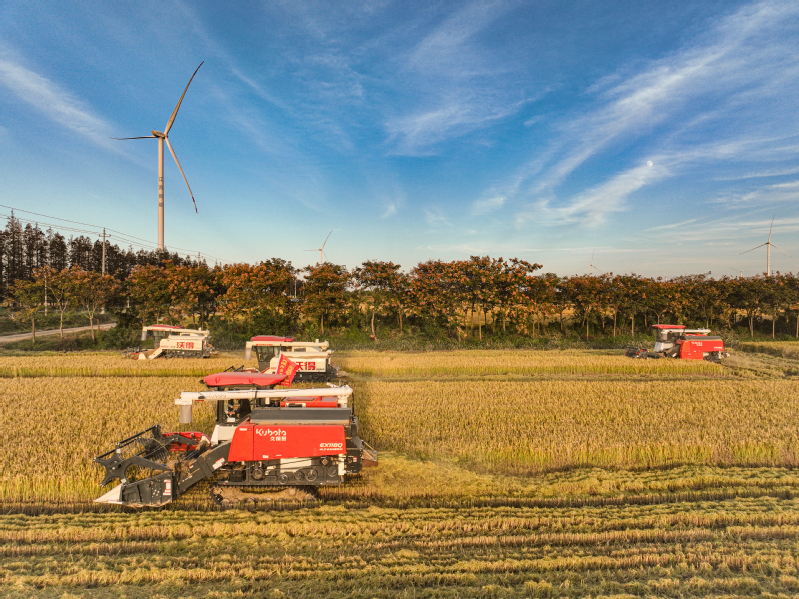 11月3日,江蘇省鹽城市射陽縣新洋農場組織收割機械,對高標準農田中的優質水稻進行搶收作業,確保秋糧顆粒歸倉,不誤農時。 作者:張偉生