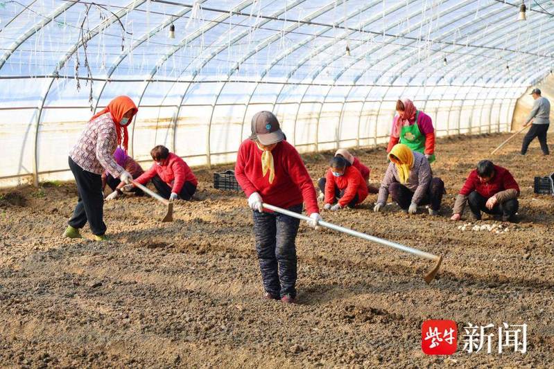 清晨,第一縷陽光穿透薄霧灑向連云港市海州區崗埠農場高效農業示范園,28號溫室大棚內暖意融融,近20名工人分工協作,鋤溝、擺種球、栽種、培土……動作嫻熟、銜接緊密,一派熱火朝天的勞作景象,為今冬海州“美麗經濟”續寫著增收新篇。
