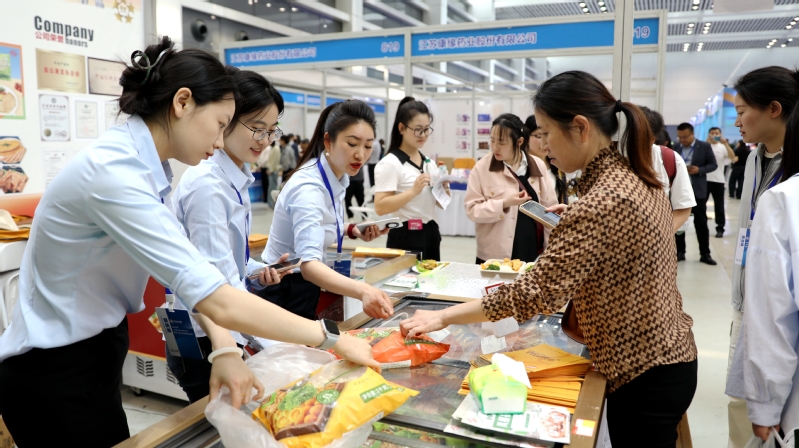 日前,“蘇新消費?夏夜生活”暨第六屆連云港網絡購物季盛大開幕。東辛農場的“簡蘇”牛奶與“東米”雞產品攜手亮相,組成“健康CP”,在展會上大放異彩,引發消費熱潮。圖為顧客在“東米”展位前采購雞產品。