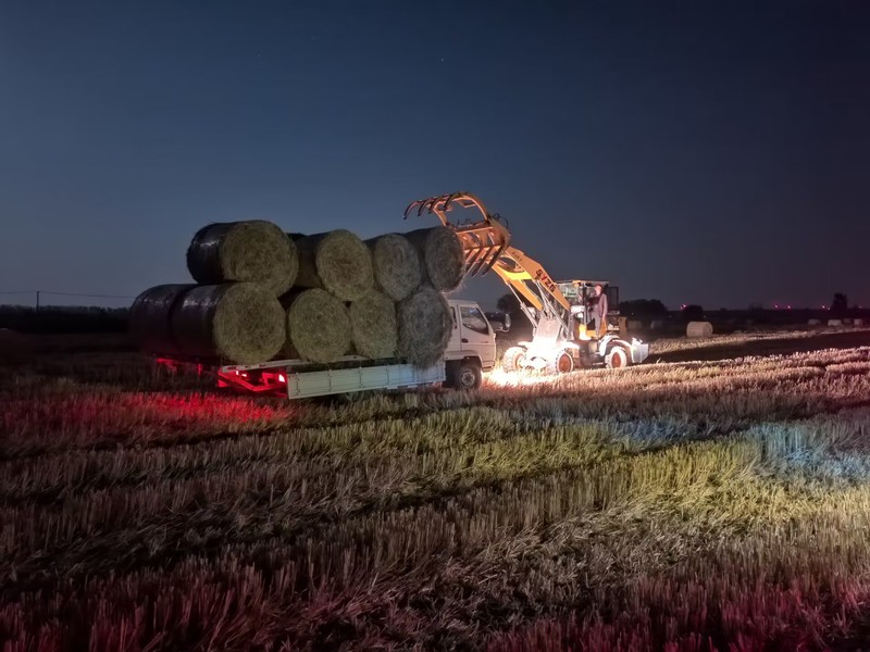 風吹稻浪,遍地金黃。在水稻收割之時,到處都是一派繁忙的豐收景象。其中,秸稈打捆機也成為新的一景,其所到之處,將散落的秸稈摟起,粉碎、壓實、打捆,秸稈被整齊有序地碼放在田野里,隨后由車輛拖運走。為加強生態環境保護,確保旋耕、播種作業時間和質量,各生產區按照“收割一塊、打捆一塊、清理一塊”的目標要求,搶抓時間開展水稻秸稈離田工作,既方便了耕種,提高秸稈綜合利用率,還能有效防止秸稈亂堆亂放引發火災事故風險,減少了安全隱患,更從源頭上減少了露天焚燒秸稈行為,極大地保護了生態環境,達到了一舉多得的效果。讓秸稈“秸”盡所能,實現經濟、社會、生態效益多贏的良好局面。 圖為10月29日晚,白馬湖分公司第五生產區組織全自動秸稈打包機、秸稈專用抓草機等在夜間回收水稻秸稈的場景。