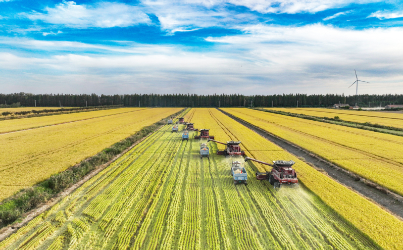 2023年10月28日,在蘇墾農發新洋分公司新南生產區19大隊的高標準農田上,五臺凱斯7088大型聯合收割機穿梭在稻田中搶收水稻。蘇墾農發新洋分公司搶抓晴好天氣,發揮農墾企業機械化優勢,確保秋糧顆粒歸倉。