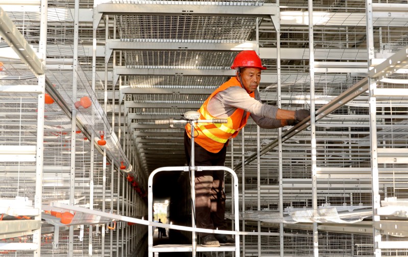 近日,新曹農場抓好抓實百萬羽蛋雞產業項目工程建設,全力以赴加快工程進度,確保年底一期工程完工,沖刺四季度。圖為現代化雞舍內部,工人緊鑼密鼓安裝、調試雞籠設施。