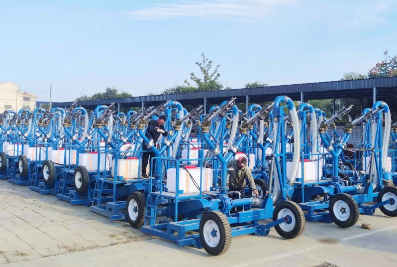 為強化農機創新創造能力,蘇墾農發淮海分公司農機總站創新工作室在取得一種噴灌機實用新型專利證書(專利號:ZL 2022 2 2927946.5)的基礎上,立即根據訂單需求,搶抓新型農機的生產。據悉,淮海分公司農機總站自行研制的噴灌機在實際運用中,設計噴水量達到230立方/小時左右,橫向噴幅可達100米以上并能較好地控制,能同時滿足兩個自然農田的噴灌抗旱需求,是今后克服農作物干旱天氣的又一神器。圖為11月1日,在農機總站內的農機驗收人員正在對出廠的噴灌機進行質量檢驗。