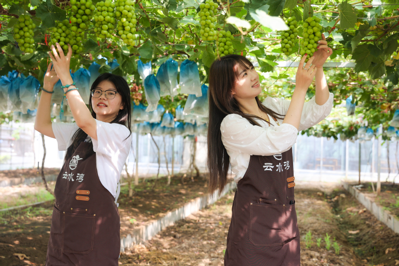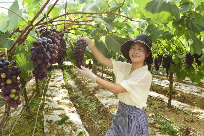 8月3日,在射陽縣淮海農場高效園區5畝連棟高架大棚葡萄園內,碩大成串的葡萄綴滿枝頭,就連空氣中也彌漫著沁人心脾、清新的水果味,經過園區工人的精心培育,一串串綠色或黑色晶瑩的葡萄掛在藤架上,令人垂涎欲滴。入口品嘗,個個飽滿多汁,甜而不膩。慕名來采摘觀光的游客,在葡萄園內一邊抬頭觀賞、一邊低頭采摘(如圖),幸福的滋味綻放在臉龐。在葡萄園里,剛剛用微信掃碼后的淮海居民吉長明興奮地說:“我每年都要來到園區買幾箱葡萄,這里的葡萄不僅口感好,果也大,讓城里的人也來嘗嘗我們農場獨特的‘土特產’?!睋v,每年城里的親朋好友每到這個季節,就要托他買幾箱葡萄帶到城里去。據了解,園內種植品種“夏黑”和“陽光玫瑰”等葡萄品種,畝產量可達4000斤上下。特別是其統一施用農家肥、無公害防蟲防病、反光膜覆蓋、科學滴灌、疏果等措施,輔助于智能化的通風調溫、噴淋調水和調節光照設施的開展,合理調節土壤水分,降低田間溫、濕度,也減輕各類病蟲害的侵襲,讓葡萄按規定設計的要求進行掛果,確保種出安全、優質的葡萄提供給消費者。“我們的葡萄每斤售價在8元/斤,一畝地毛收入可達20000元?!眻@區負責人解進空說,“是良好的品質和采摘