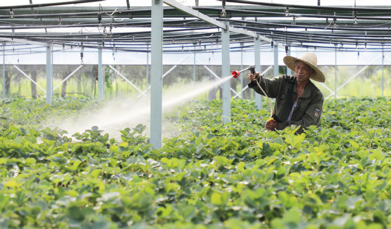 7月9日,三河農(nóng)場農(nóng)業(yè)科技示范園工作人員對草莓苗開展降溫除濕、打藥、打老葉等工作。