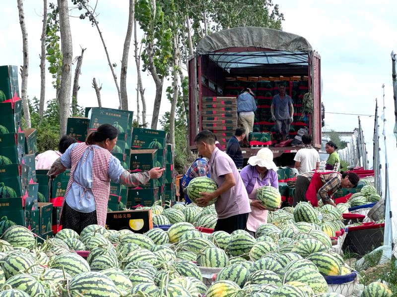 7月8日清晨6點,東壩頭農(nóng)場的西瓜大棚已是一片繁忙。翠綠的瓜葉間,一個個飽滿圓潤的西瓜點綴其間,空氣中彌漫著清甜的果香。目前,每天有近20噸西瓜從這里出發(fā),通過物流專線發(fā)往廣州、上海、杭州等城市的生鮮市場和大型商超。