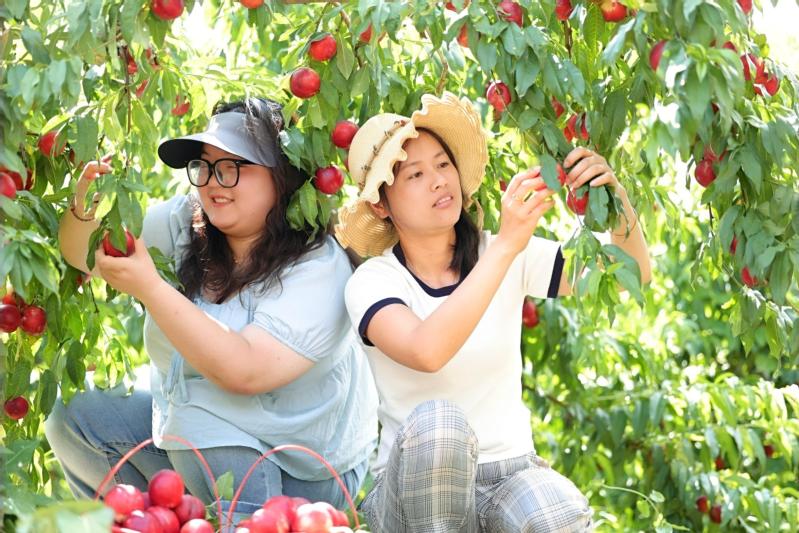近日,云臺農(nóng)場云水灣濕地公園近30畝桃樹進入成熟采摘期,色澤誘人、果香四溢,吸引眾多游客前來采摘、觀賞和客戶訂購。圖為游客置身云水灣桃園內(nèi)采摘成熟的油桃,在濕地景觀環(huán)繞中體驗采摘樂趣。